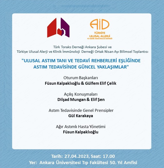 Türk Toraks Derneği Ankara Şubesi ve Türkiye Ulusal Alerji ve Klinik İmmünoloji Derneği Ortak Nisan Ayı Bilimsel Toplantı Duyurumuz: "Ulusal Astım Tanı ve Tedavi Rehberleri Eşliğinde Astım Tedavisinde Güncel Yaklaşımlar"