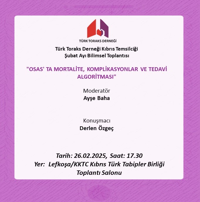 Türk Toraks Derneği Kıbrıs Temsilciği Şubat Ayı Bilimsel Toplantısı Duyurumuz: "Osas' ta Mortalite, Komplikasyonlar ve Tedavi Algoritması"