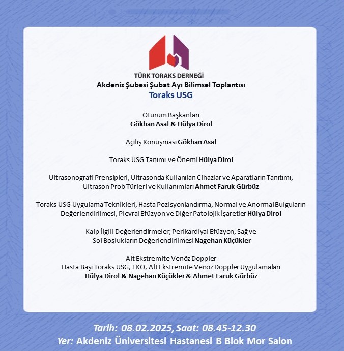 Türk Toraks Derneği Akdeniz Şube Şubat Ayı Bilimsel Toplantı Duyurumuz: "Toraks USG"