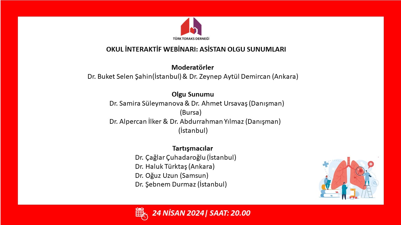 Türk Toraks Derneği okulu interaktif webinarının on beşincisi 24 Nisan 2024 Çarşamba günü, saat 20.00 da “Asistan Olgu Sunumları” başlığı ile gerçekleştirilecek olup; katılımlarınız onur verecektir.