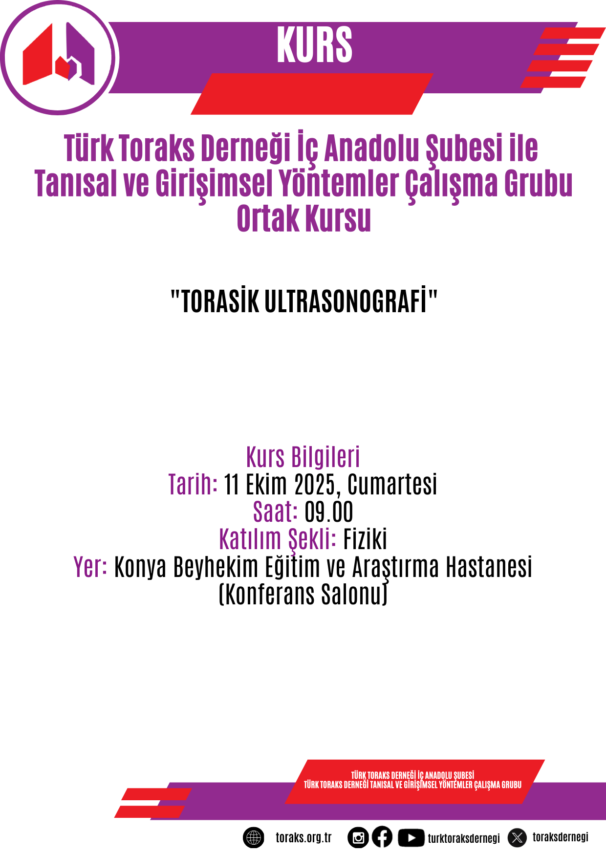 Türk Toraks Derneği İç Anadolu Şubesi'nin Tanısal ve Girişimsel Yöntemler Çalışma Grubu ile ortak düzenlediği "Torasik Ultrasonografi Kursu" 11 Ekim 2025 Cumartesi günü, saat 09.00' da Konya' da gerçekleştirilecektir.