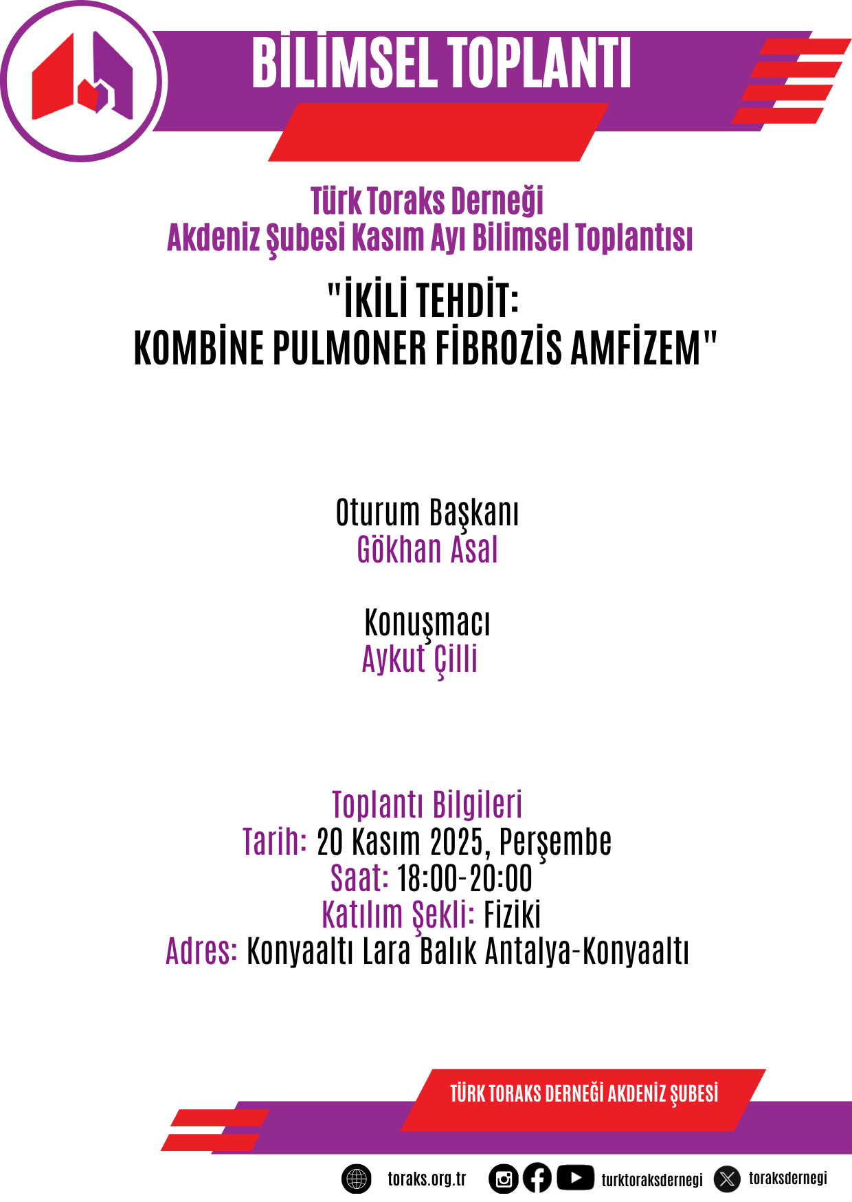 Türk Toraks Derneği Akdeniz Şubesi Kasım Ayı Bilimsel Toplantısı Duyurumuz: "İkili Tehdit: Kombine Pulmoner Fibrozis Amfizem"