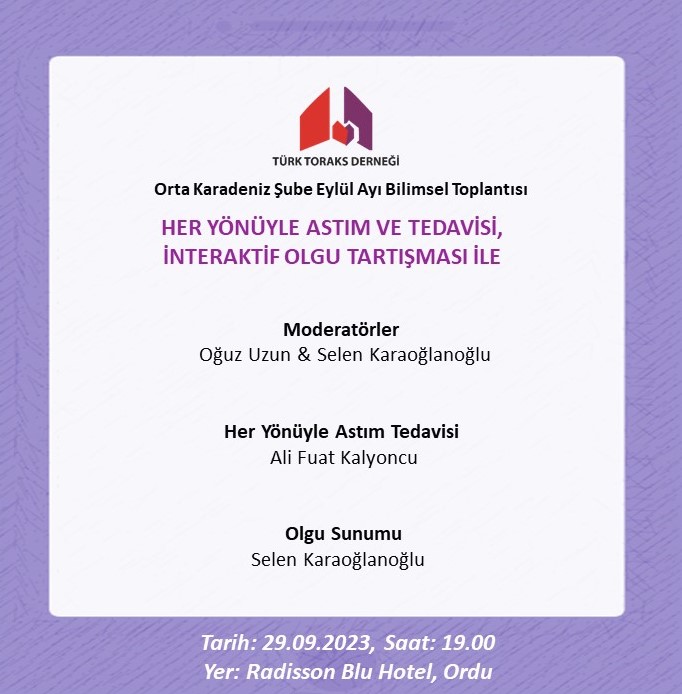 Türk Toraks Derneği Orta Karadeniz Şubesi Eylül Ayı Bilimsel Toplantısı Duyurumuz: "Her Yönüyle Astım ve Tedavisi, İnteraktif Olgu Tartışması ile"