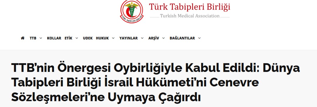Dünya Tabipleri Birliği (DTB) Genel Kurulu, 7-11 Ekim 2025 tarihlerinde Portekiz’in Porto kentinde gerçekleştirilen toplantısında, İsrail Hükümetini Cenevre Sözleşmeleri ve uluslararası insancıl hukuk düzenlemelerine uymaya çağıran bir tutum belgesini kabul etmiştir.