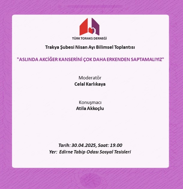 Türk Toraks Derneği Trakya Şubesi Nisan ayı bilimsel toplantısı 30 Nisan 2025 Çarşamba günü, 19.00-20.30 saatleri arasında Edirne' de gerçekleşecektir.