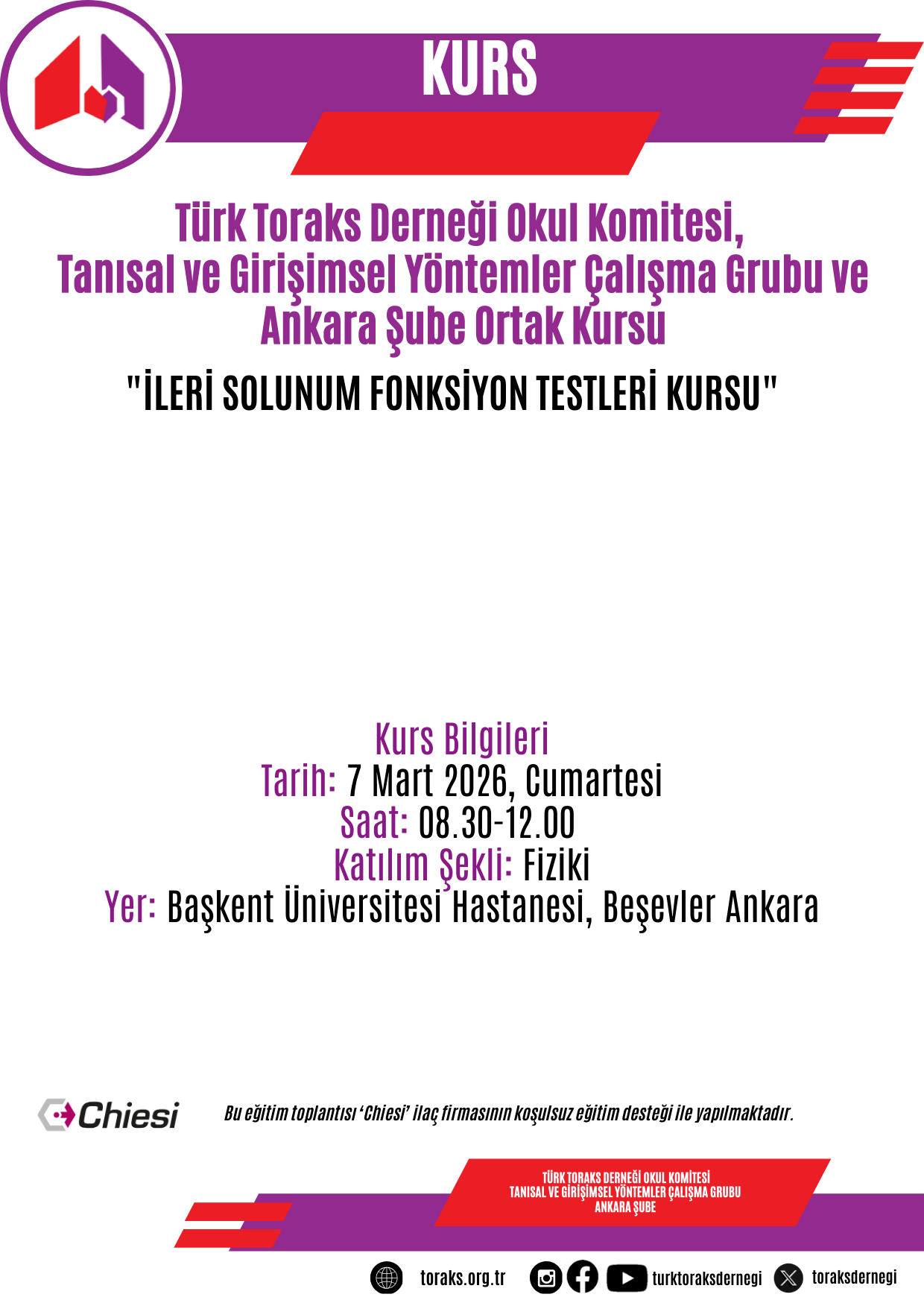 Türk Toraks Derneği Okul Komitesi, Tanısal ve Girişimsel Yöntemler Çalışma Grubu ve Ankara Şube ortak "İleri Solunum Fonksiyon Testleri Kursu" 7 Mart 2026 Cumartesi günü, 08.30-12.00 saatleri arasında Ankara' da yapılacaktır.