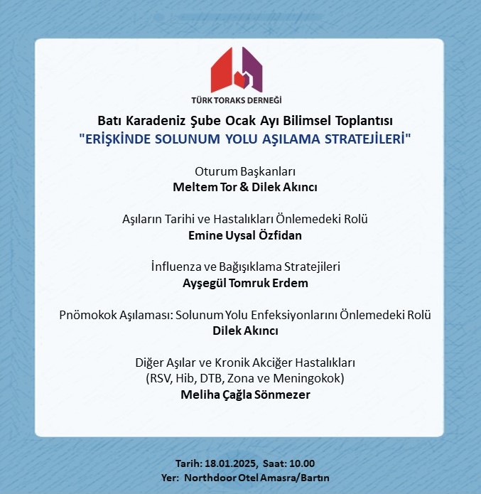 Türk Toraks Derneği Batı Karadeniz Şubesi Ocak Ayı Bilimsel Toplantı Duyurumuz: "Erişkinde Solunum Yolu Aşılama Stratejileri"
