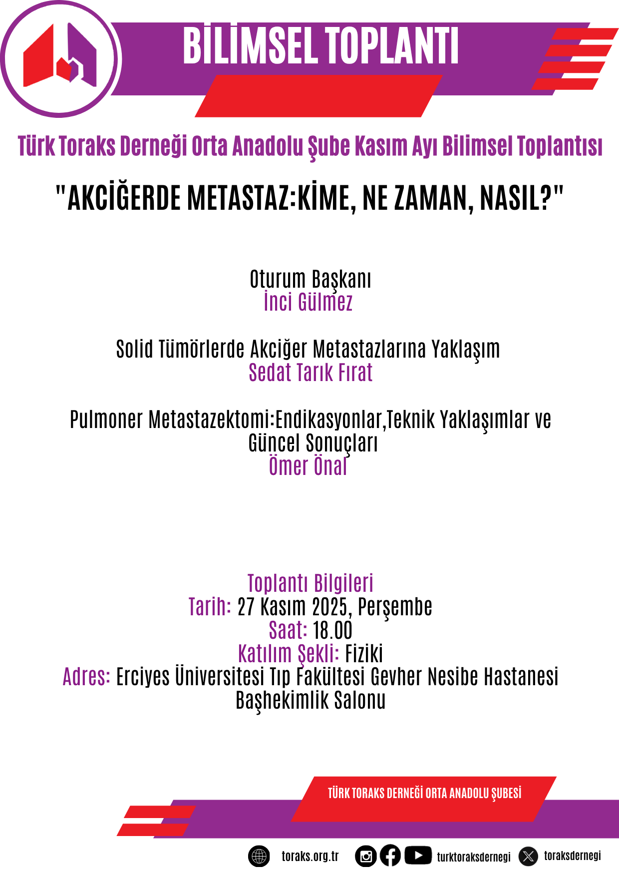 Toplantının başlığı "Akciğerde Metastaz:Kime, Ne Zaman, Nasıl?" olarak belirlenmiş olup; programın ayrıntılarına duyurumuzda yer verilmiştir.
