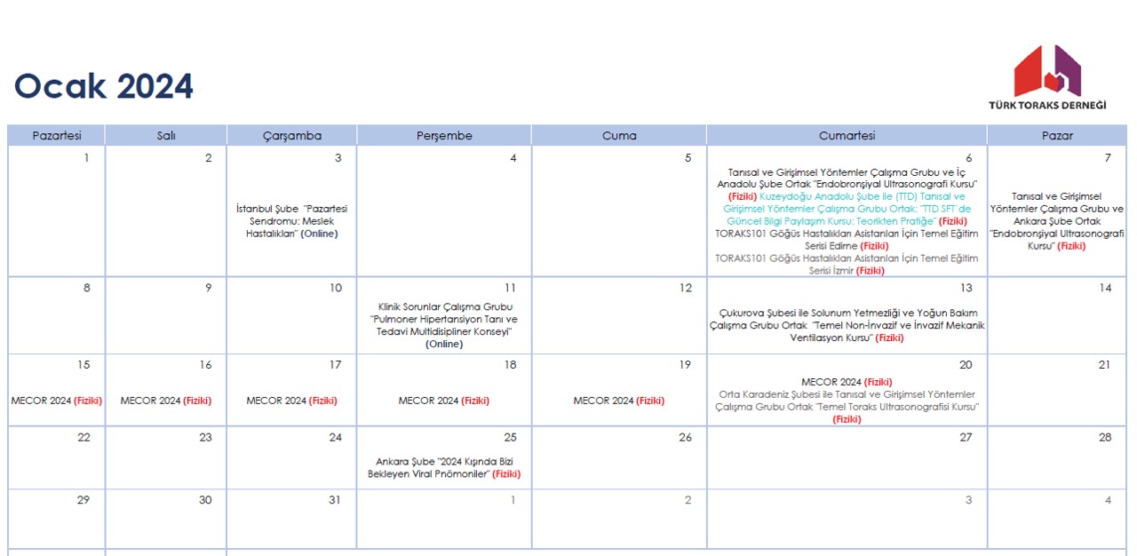 Türk Toraks Derneği Ocak 2024 Etkinlik Takvimi