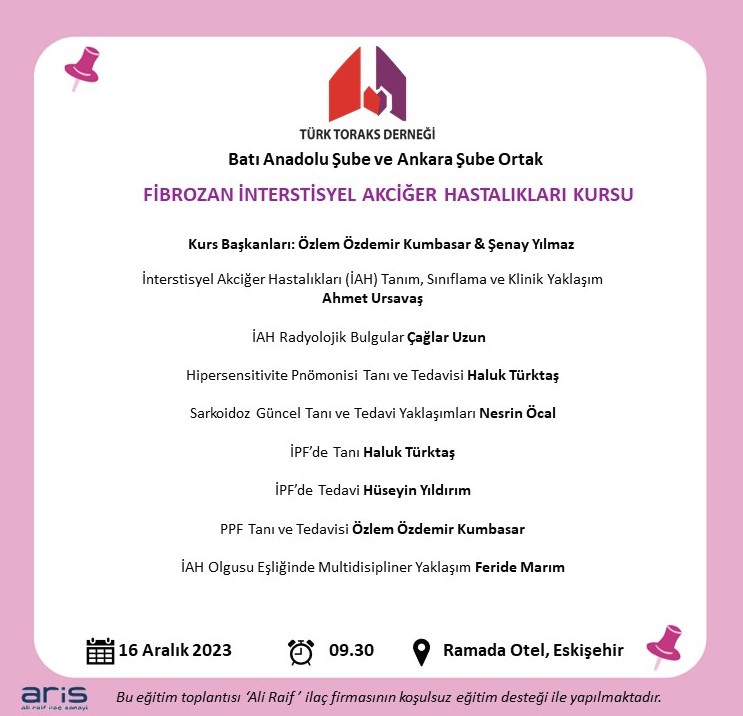 Türk Toraks Derneği Batı Anadolu Şubesi ve Ankara Şubesi ortak "Fibrozan İnterstisyel Akciğer Hastalıkları" Kursu 16 Aralık 2023 Cumartesi günü, 09.30 da Eskişehir' de yapılacaktır.