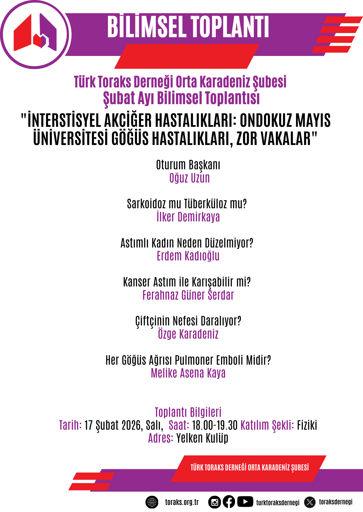 Türk Toraks Derneği Orta Karadeniz Şubesi Şubat ayı bilimsel toplantısı 17 Şubat 2026 Salı günü, 18.00-19.30 saatleri arasında Samsun' da gerçekleştirilecektir.