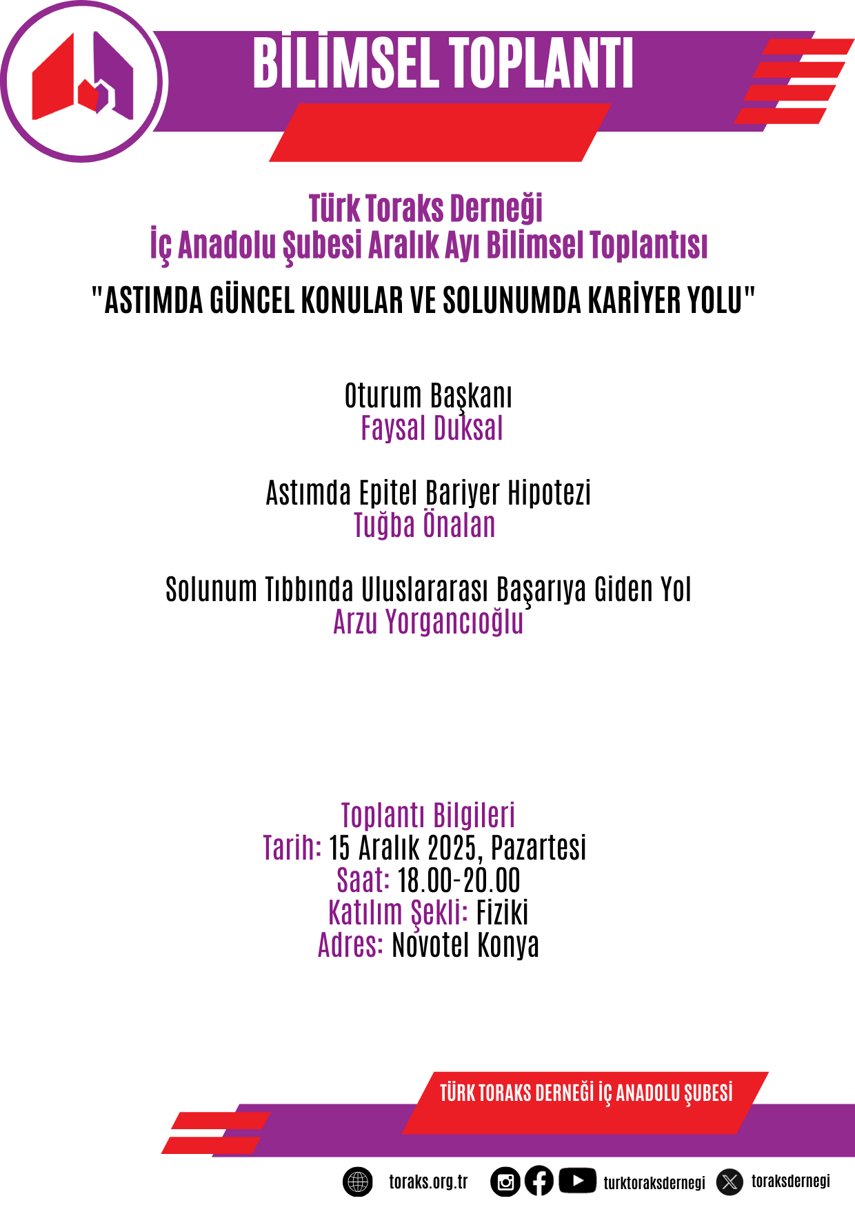 Türk Toraks Derneği İç Anadolu Şubesi Aralık ayı toplantısı 15 Aralık 2025 Pazartesi günü, 18.00-20.00 saatleri arasında Konya' da gerçekleştirilecektir.