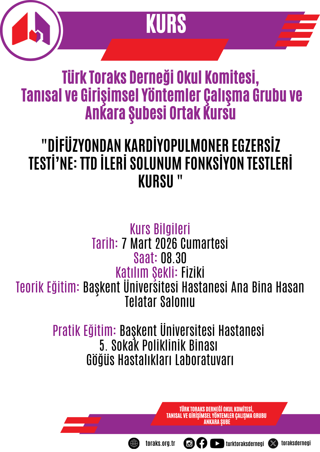 7 Mart 2026 Cumartesi günü Ankara' da gerçekleştirilecek olan "Difüzyondan Kardiyopulmoner Egzersiz Testi’ne: TTD İleri Solunum Fonksiyon Testleri Kursu" katılımcı listesi ekte bilgilerinize sunulmuştur.