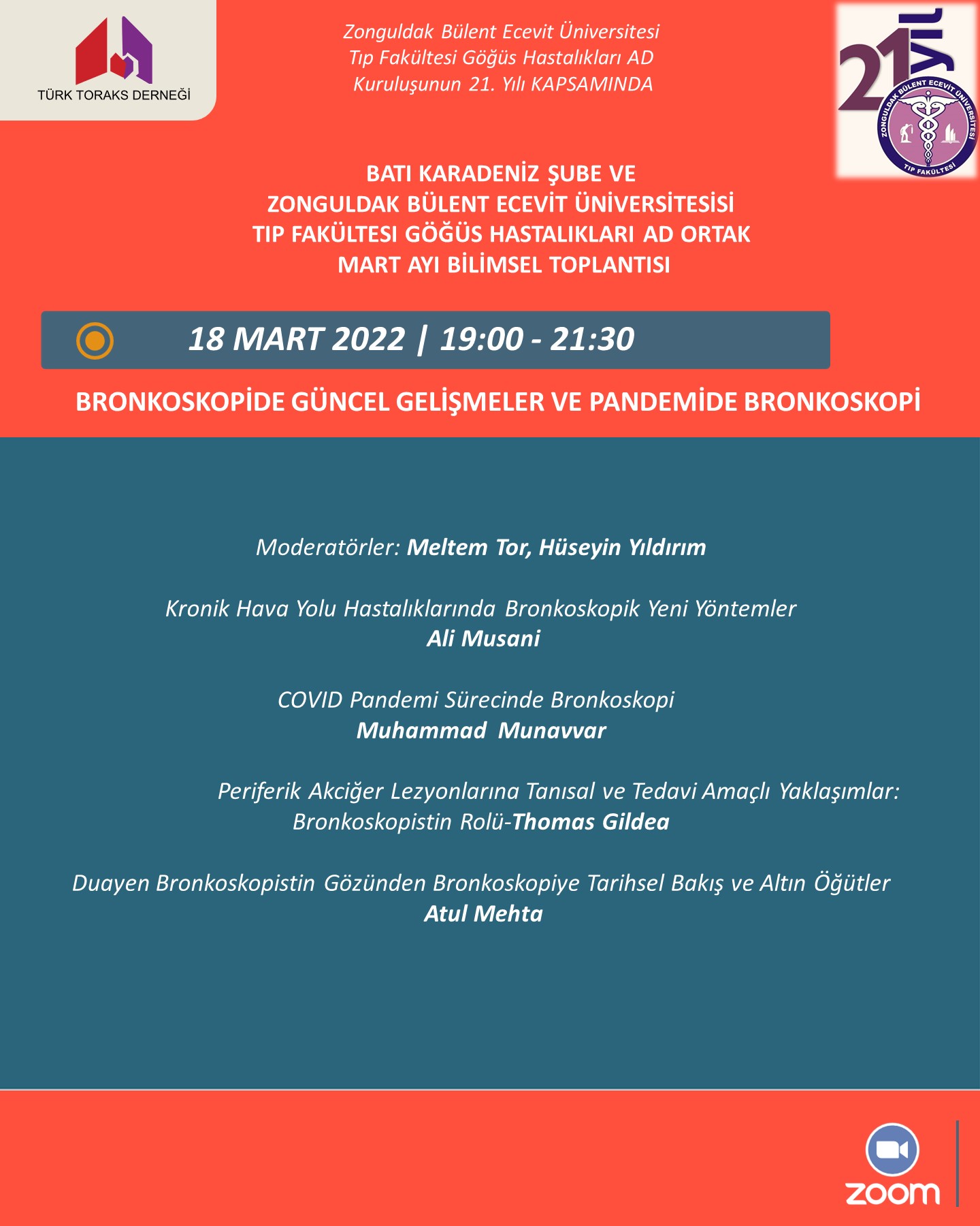 Türk Toraks Derneği Batı Karadeniz Şube ve Zonguldak Bülent Ecevit Üniversitesi Tıp Fakültesi Göğüs Hastalıkları AD Ortak Mart Ayı Webinar Duyurumuz: "Bronkoskopide Güncel Gelişmeler ve Pandemide Bronkoskopi"