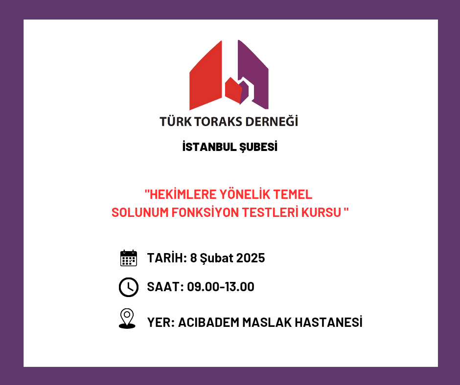 Türk Toraks Derneği İstanbul Şubesi “Hekimlere Yönelik Temel Solunum Fonksiyon Testleri Kursu" 8 Şubat 2025 Cumartesi günü, İstanbul' da gerçekleştirilecektir.