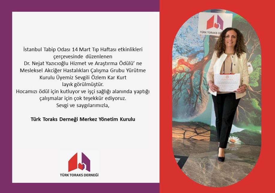 İstanbul Tabip Odası 14 Mart Tıp Haftası etkinlikleri çerçevesinde düzenlenen Dr. Nejat Yazıcıoğlu Hizmet ve Araştırma Ödülü’ ne Mesleksel Akciğer Hastalıkları Çalışma Grubu Yürütme Kurulu Üyemiz Sevgili Özlem Kar Kurt layık görülmüştür.