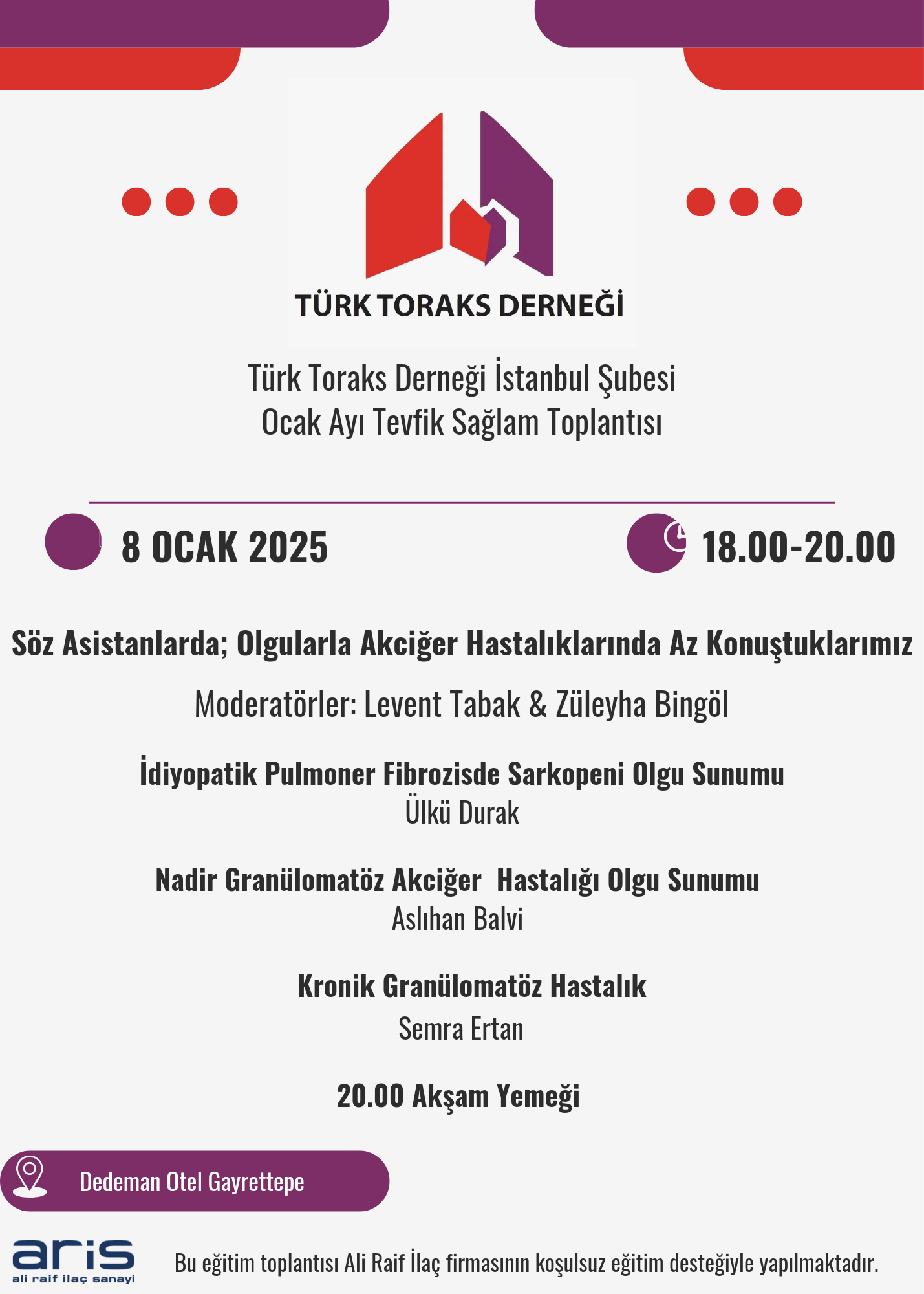 Türk Toraks Derneği İstanbul Şubesi Ocak Ayı Tevfik Sağlam Toplantısı 8 Ocak 2025 Çarşamba günü, saat 18.00' da Dedeman Otel Gayrettepe' de gerçekleşecektir.