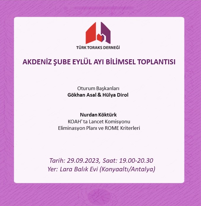 Türk Toraks Derneği Akdeniz Şube Eylül ayı bilimsel toplantısı 29 Eylül 2023 Cuma günü, 19.00-20.30 saatleri arasında Antalya' da gerçekleşecektir.