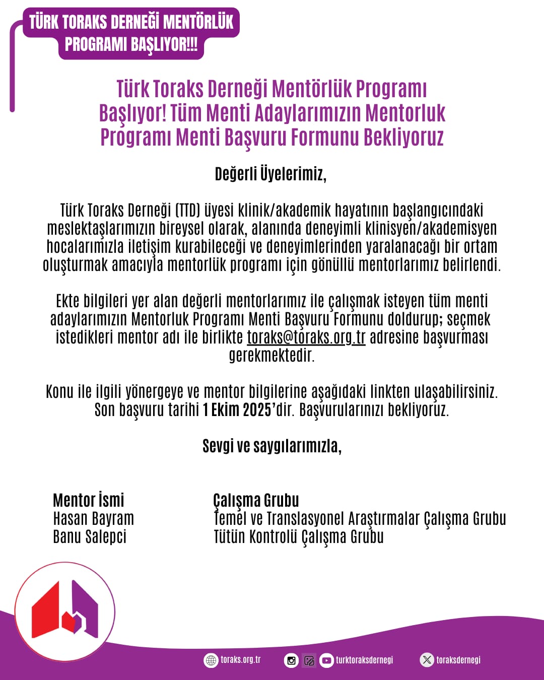 Türk Toraks Derneği (TTD) üyesi klinik/akademik hayatının başlangıcındaki meslektaşlarımızın bireysel olarak, alanında deneyimli klinisyen/akademisyen hocalarımızla iletişim kurabileceği ve deneyimlerinden yaralanacağı bir ortam oluşturmak amacıyla mentorlük programı için gönüllü mentorlarımız belirlendi.