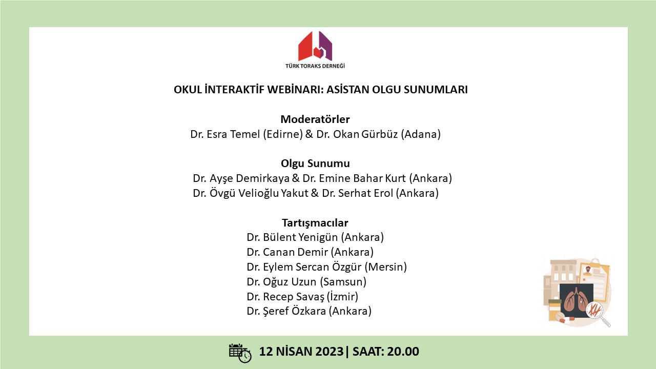 Türk Toraks Derneği okulu interaktif webinarının on birincisi 12 Nisan 2023 Çarşamba günü, saat 20.00 da “Asistan Olgu Sunumları” başlığı ile gerçekleştirilecek olup; katılımlarınız onur verecektir.
