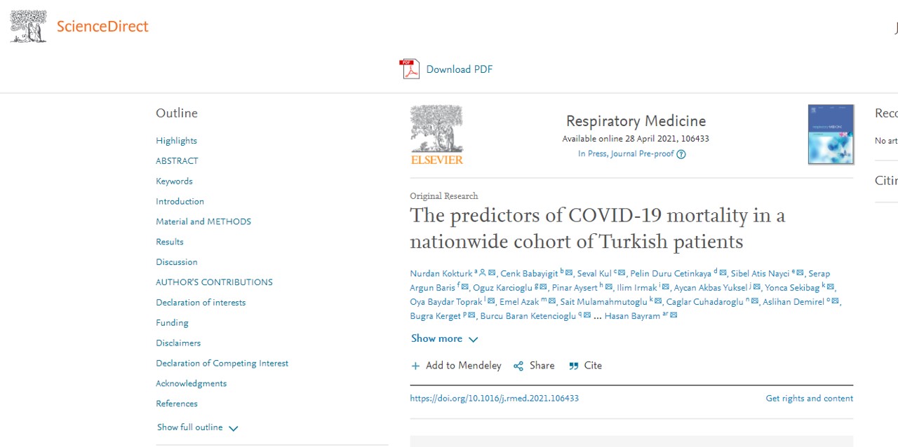 Derneğimizin çok merkezli çalışması olan "The predictors of COVID-19 mortality in a nationwide cohort of Turkish patients" başlıklı makalemiz Respiratory Medicine Dergisi'nde yayınlanmıştır.