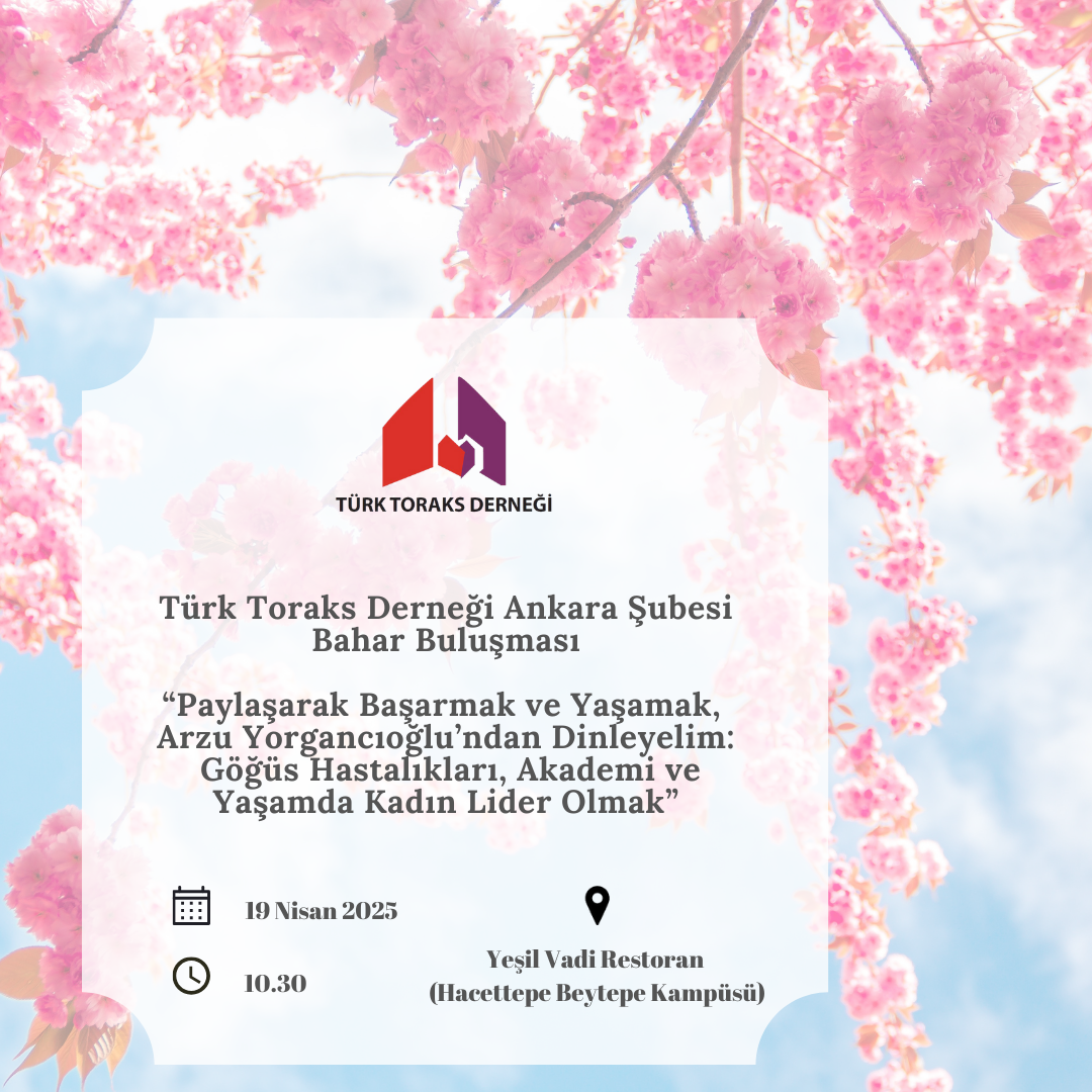 Türk Toraks Derneği Ankara Şubesi Bahar Buluşması 19 Nisan 2025 Cumartesi günü, saat 10.30 da Ankara' da gerçekleştirilecektir.