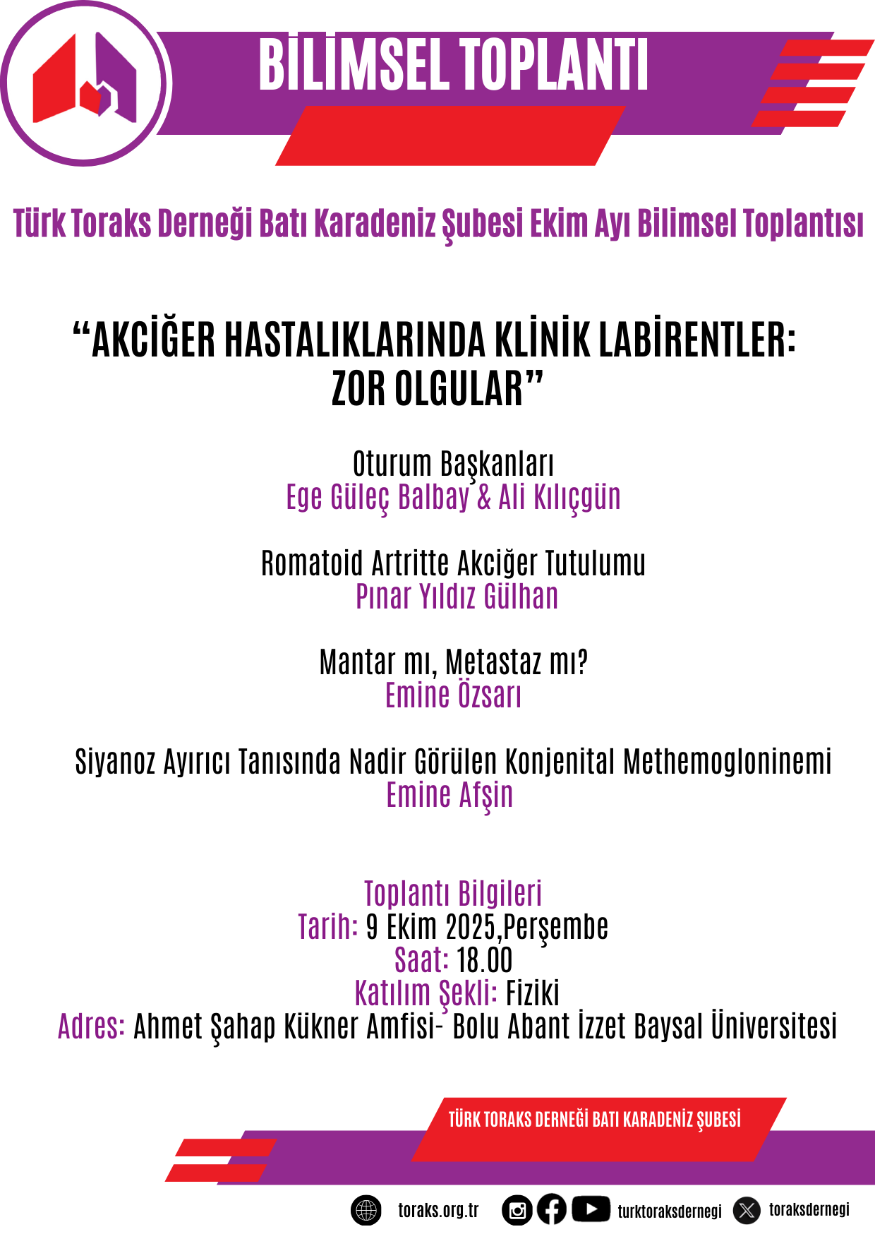 Türk Toraks Derneği Batı Karadeniz Şubesi Ekim Ayı Bilimsel Toplantı Duyurumuz: "Akciğer Hastalıklarında Klinik Labirentler: Zor Olgular"
