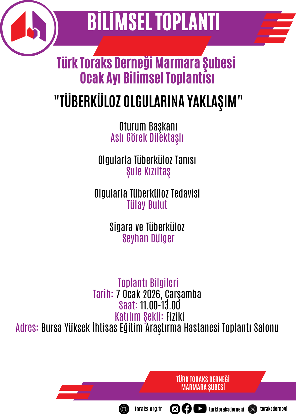 Toplantının başlığı "Tüberküloz Olgularına Yaklaşım" olarak belirlenmiş olup, programın ayrıntılarına duyurumuzda yer verilmiştir.