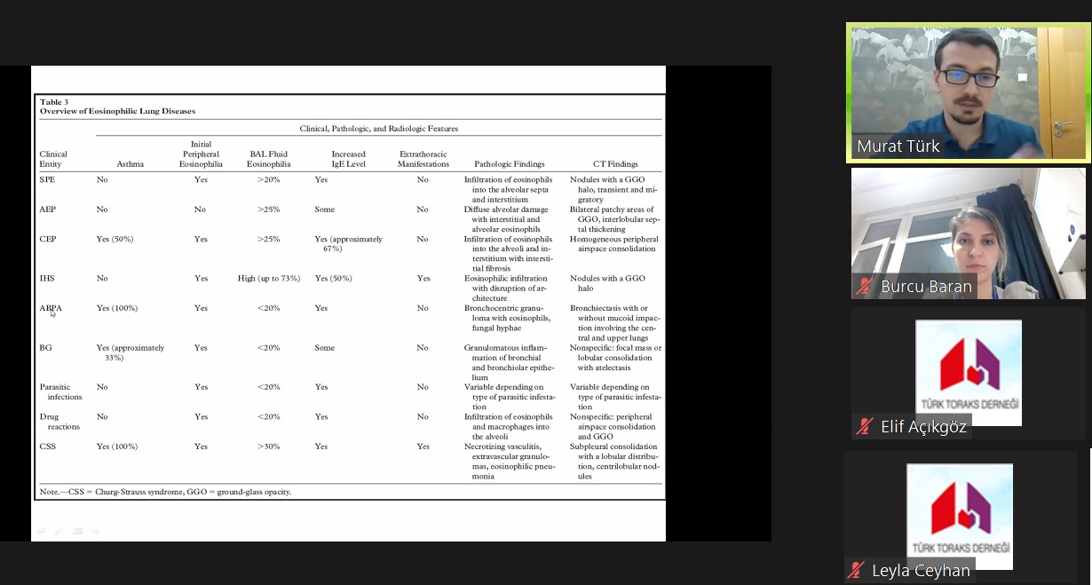 Dr. Burcu Baran Ketencioğlu moderatörlüğünde; “Olgular Eşliğinde Eozinofili ve Total IGE Yüksekliği ile Seyreden Pulmoner Hastalıkların Yönetimi” Dr. Murat Türk tarafından tarafından aktarıldı.