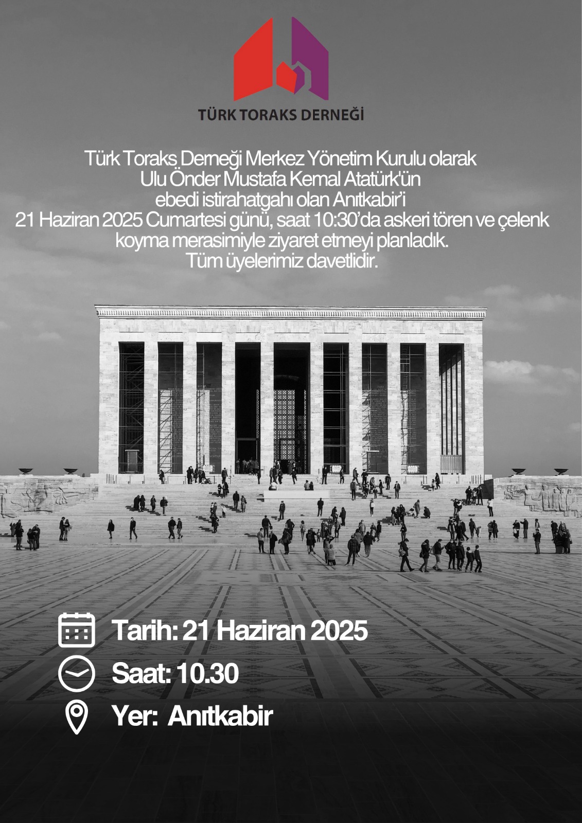 Türk Toraks Derneği Merkez Yönetim Kurulu olarak Ulu Önder Mustafa Kemal Atatürk'ün ebedi istirahatgahı olan Anıtkabir’i 21 Haziran 2025 Cumartesi günü, saat 10:30’da askeri tören ve çelenk koyma merasimiyle ziyaret etmeyi planladık.