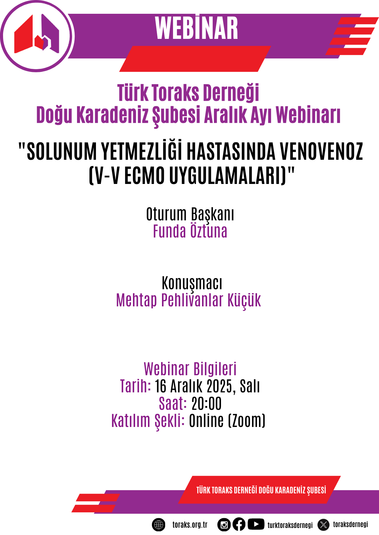 Türk Toraks Derneği Doğu Karadeniz Şubesi Aralık Ayı Webinar Duyurumuz: "Solunum Yetmezliği Hastasında Venovenoz (V-V ECMO Uygulamaları)"