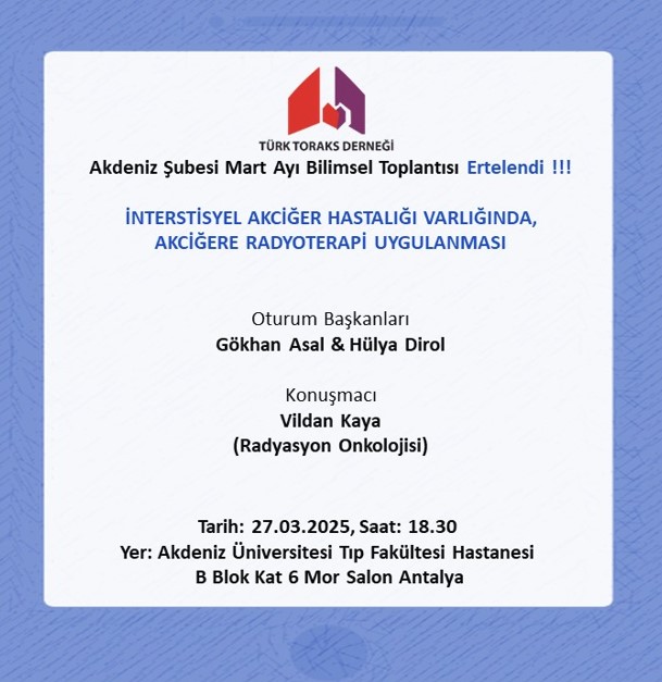 Türk Toraks Derneği Akdeniz Şube Mart Ayı Bilimsel Toplantısı "İnterstisyel Akciğer Hastalığı Varlığında, Akciğere Radyoterapi Uygulanması" Ertelendi
