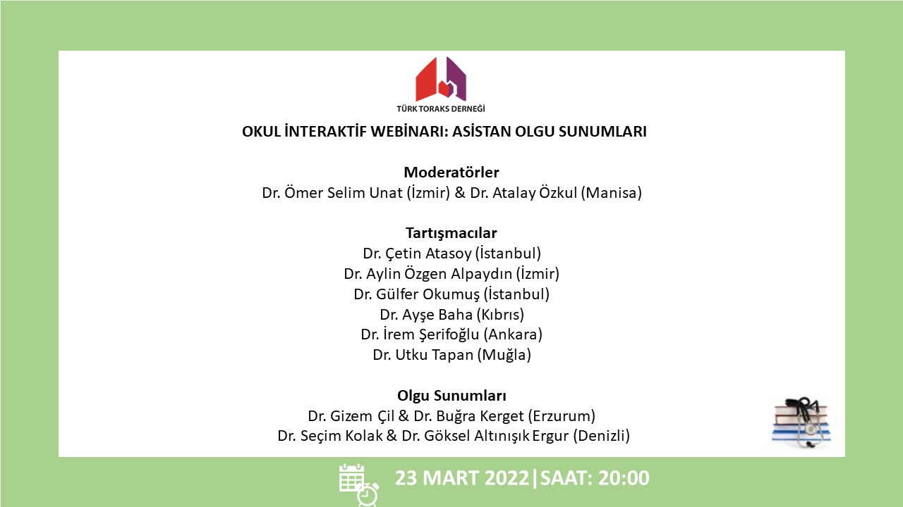 Türk Toraks Derneği okulu interaktif webinarının üçüncüsü 23 Mart 2022 Çarşamba günü, saat 20.00 da “Asistan Olgu Sunumları” başlığı ile gerçekleştirilecek olup; katılımlarınız onur verecektir.