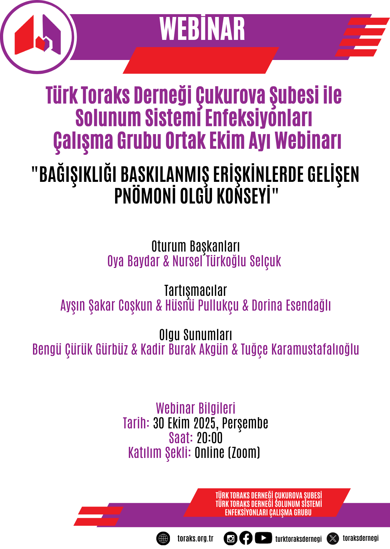 Türk Toraks Derneği Çukurova Şubesi'nin Solunum Sistemi Enfeksiyonları Çalışma Grubu ile ortak düzenlediği Ekim ayı webinarı "Bağışıklığı Baskılanmış Erişkinlerde Gelişen Pnömoni Olgu Konseyi" başlığı ile 30 Ekim 2025 Perşembe günü, saat 20.00 da online olarak gerçekleştirilecektir.