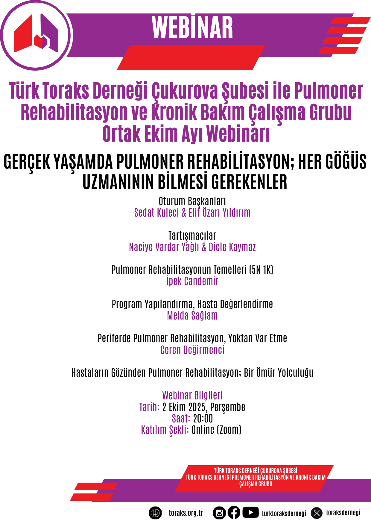 Türk Toraks Derneği Çukurova Şubesi'nin Pulmoner Rehabilitasyon ve Kronik Bakım Çalışma Grubu ile ortak düzenlediği Ekim ayı webinarı "Gerçek Yaşamda Pulmoner Rehabilitasyon; HER GÖĞÜS UZMANININ BİLMESİ GEREKENLER" başlığı ile 2 Ekim 2025 Perşembe günü, saat 20.00 da online olarak gerçekleştirilecektir.