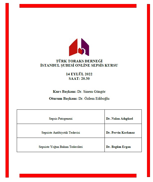 Türk Toraks Derneği İstanbul Şubesi "Sepsis Kursu" 14.09.2022 Çarşamba günü saat 20.30' da online olarak gerçekleştirilecektir.