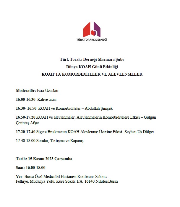 Dünya KOAH günü nedeni ile Türk Toraks Derneği Marmara Şubesi Kasım ayı bilimsel toplantısı 15 Kasım 2023 Çarşamba günü, 16.00 da Bursa' da gerçekleştirilecektir.