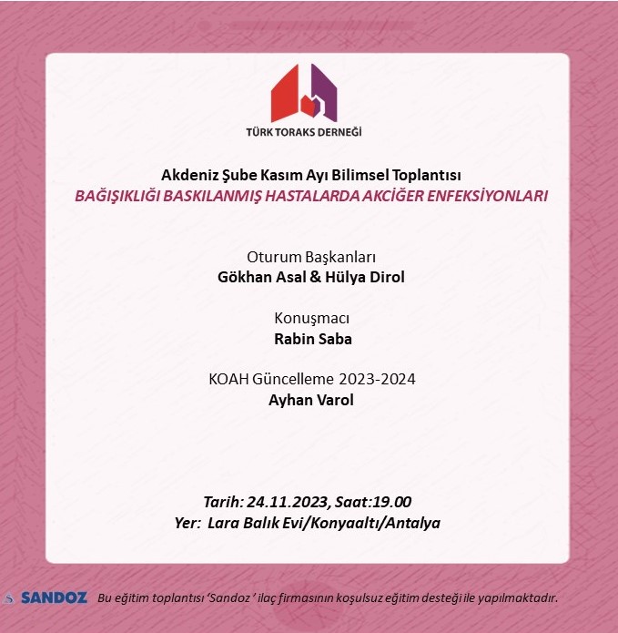 Türk Toraks Derneği Akdeniz Şube Kasım Ayı Bilimsel Toplantı Duyurumuz: "Bağışıklığı Baskılanmış Hastalarda Akciğer Enfeksiyonları"