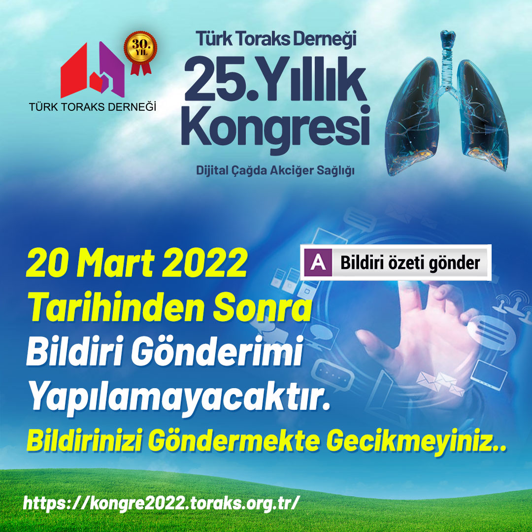 Türk Toraks Derneği 25. Yıllık Kongresi Bildiri Gönderimi Son Kez 20 Mart 2022 Tarihine Kadar Uzatılmıştır.