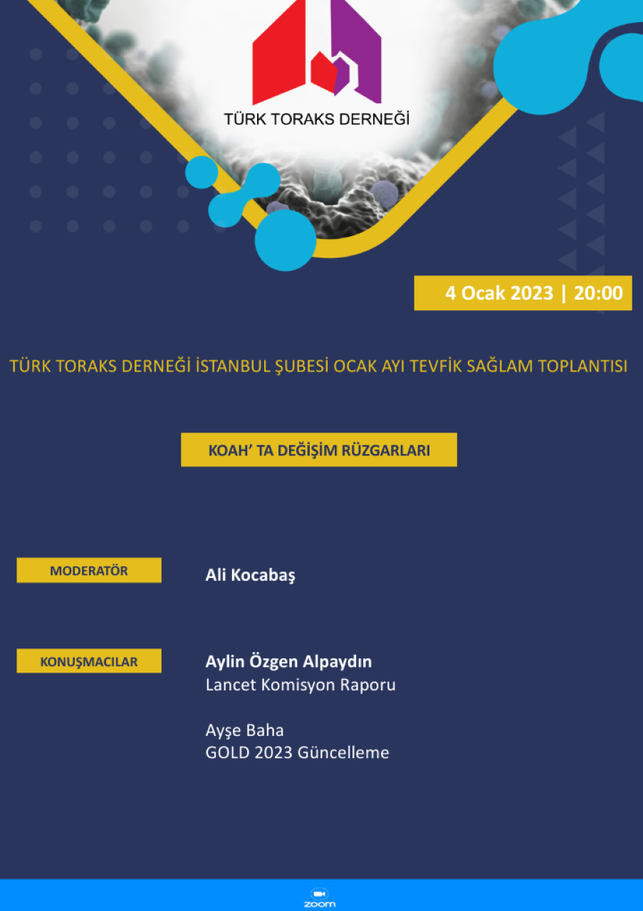 Türk Toraks Derneği İstanbul Şubesi Ocak ayı webinarı 4 Ocak 2023 Çarşamba günü, saat 20.00' da gerçekleşecektir.
