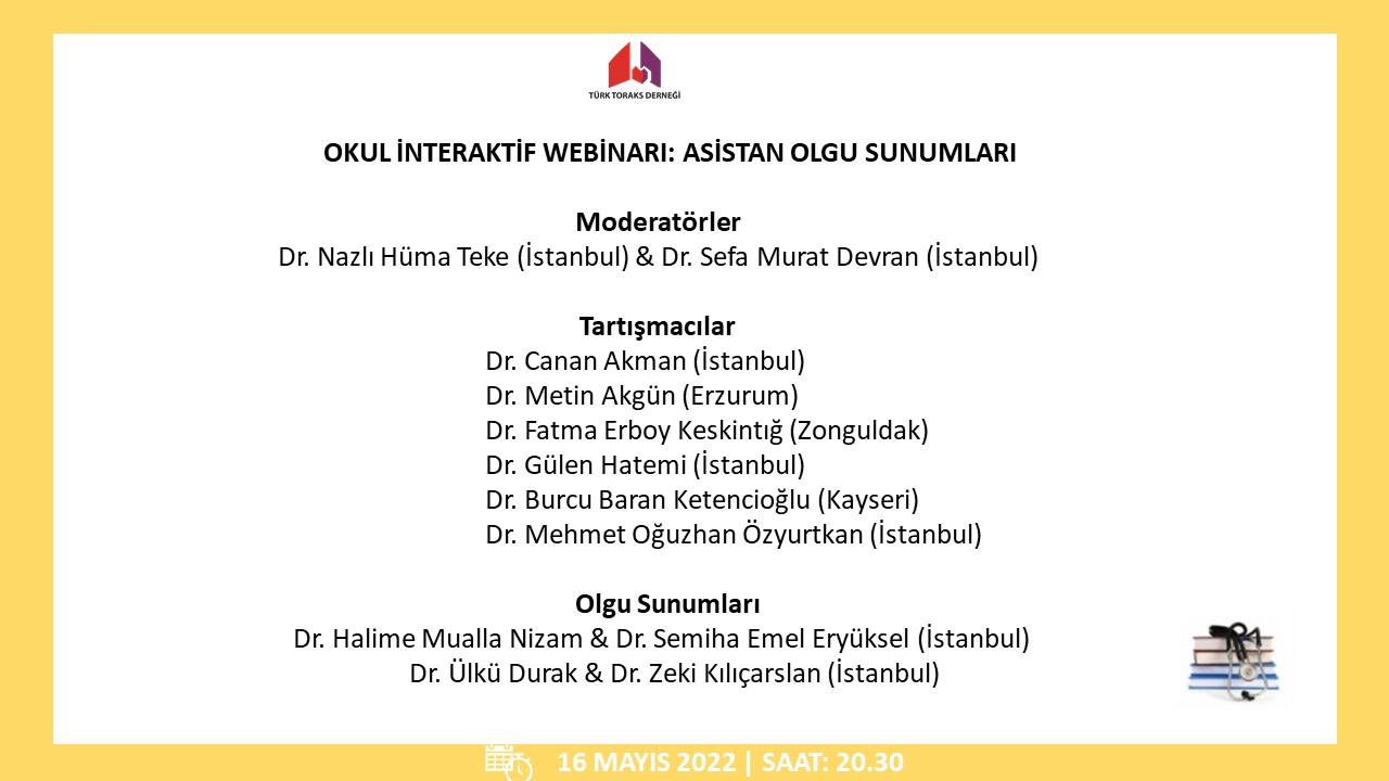 Türk Toraks Derneği okulu interaktif webinarının altıncısı 16 Mayıs 2022 Pazartesi günü, saat 20.30 da “Asistan Olgu Sunumları” başlığı ile gerçekleştirilecek olup; katılımlarınız onur verecektir.