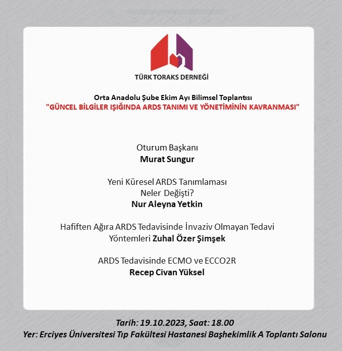 Türk Toraks Derneği Orta Anadolu Şube Ekim Ayı Bilimsel Toplantı Duyurumuz: "Güncel Bilgiler Işığında ARDS Tanımı ve Yönetiminin Kavranması"