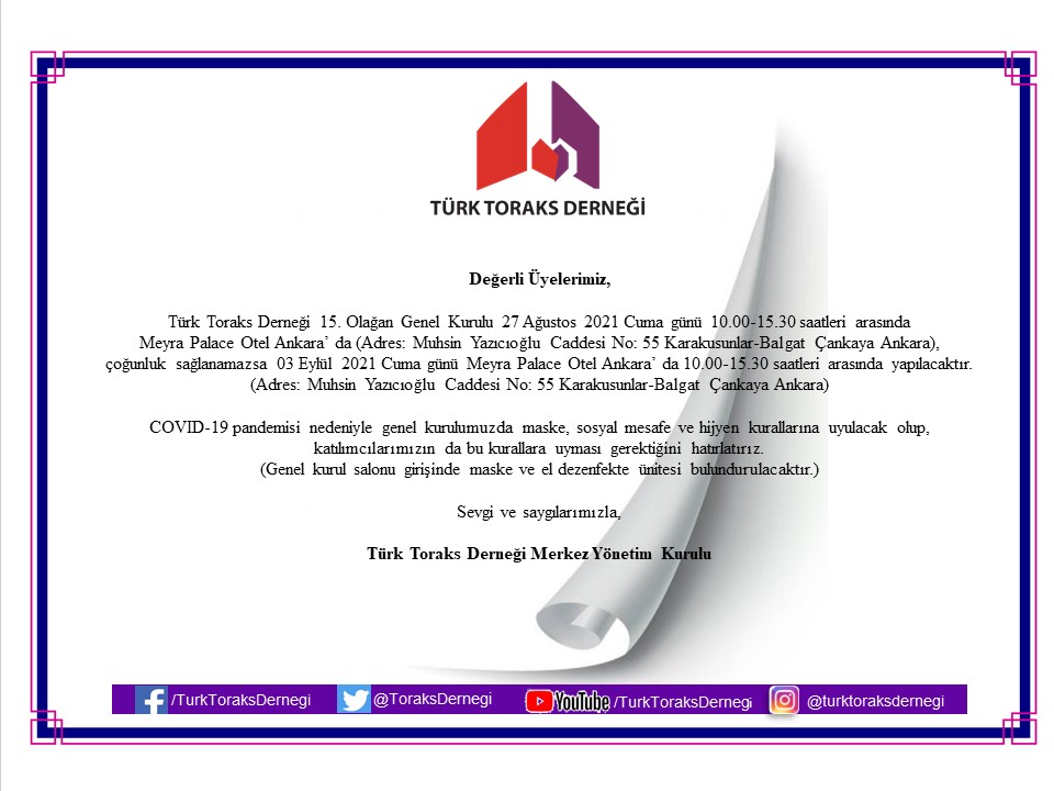 Türk Toraks Derneği 15. Olağan Genel Kurulu 27 Ağustos 2021 Cuma günü 10.00-15.30 saatleri arasında Meyra Palace Otel Ankara’ da (Adres: Muhsin Yazıcıoğlu Caddesi No: 55 Karakusunlar-Balgat Çankaya Ankara), çoğunluk sağlanamazsa 03 Eylül 2021 Cuma günü Meyra Palace Otel Ankara’ da 10.00-15.30 saatleri arasında yapılacaktır. (Adres: Muhsin Yazıcıoğlu Caddesi No: 55 Karakusunlar-Balgat Çankaya Ankara)