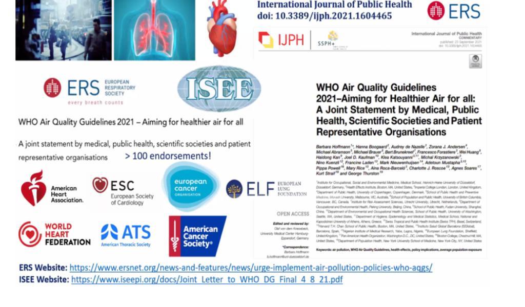 Avrupa Solunum Derneği (ERS) ve Türk Toraks Derneği’nin de dahil olduğu 100'den fazla dernek tarafından yapılan açıklamada, yakın zamanda yayınlanan 2021 Dünya Sağlık Örgütü (DSÖ-WHO) Küresel Hava Kalitesi Kılavuzu’na verdikleri destek vurgulanıyor . Sağlık uzmanları bu kılavuzun etkili hava kalitesi ve dünya çapında emisyon azaltma politikaları için bir rehber olarak kullanılması gerektiğini belirtiyor.