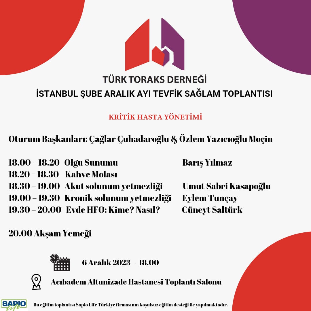 Türk Toraks Derneği İstanbul Şubesi Aralık Ayı Tevfik Sağlam Toplantısı Duyurumuz "Kritik Hasta Yönetimi"