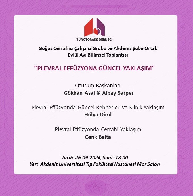 Türk Toraks Derneği Göğüs Cerrahisi Çalışma Grubu ve Akdeniz Şube Ortak Eylül Ayı Bilimsel Toplantı Duyurumuz: "Plevral Effüzyona Güncel Yaklaşım"