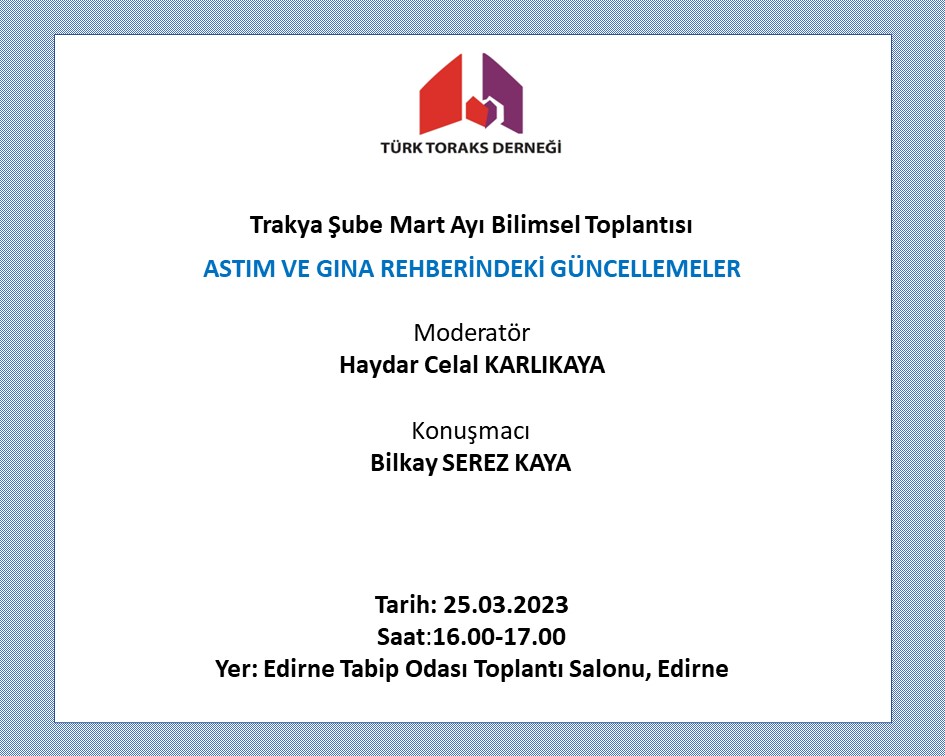 Türk Toraks Derneği Trakya şubesi Mart ayı bilimsel toplantısı 25 Mart 2023 Cumartesi günü, 16.00-17.00 saatleri arasında "Astım ve GINA Rehberindeki Güncellemeler" başlığı ile gerçekleşecektir.