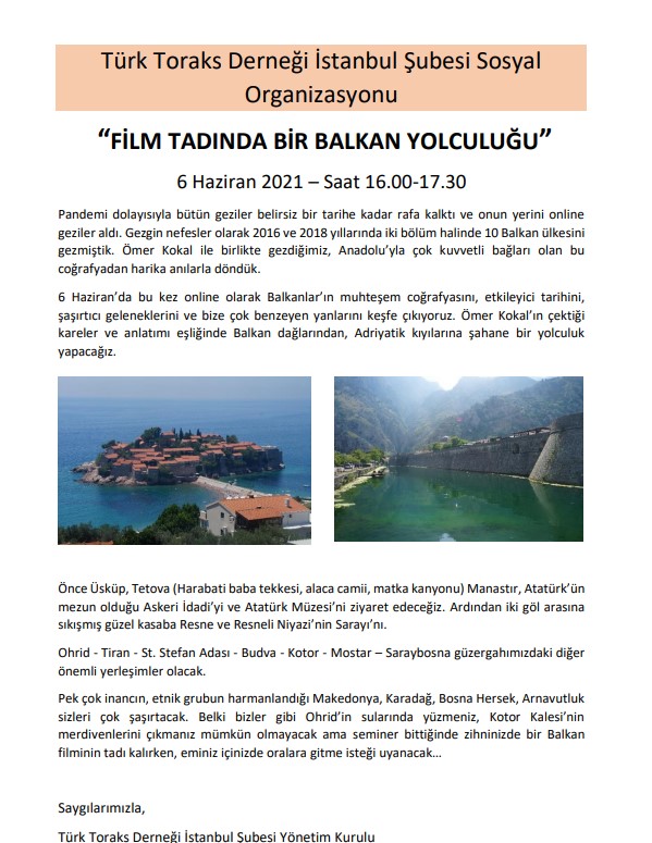 Türk Toraks Derneği İstanbul Şubesi olarak online düzenleyeceğimiz, "Film Tadında Bir Balkan Yolculuğu" isimli sosyal aktivitemize sizleri davet ediyoruz.