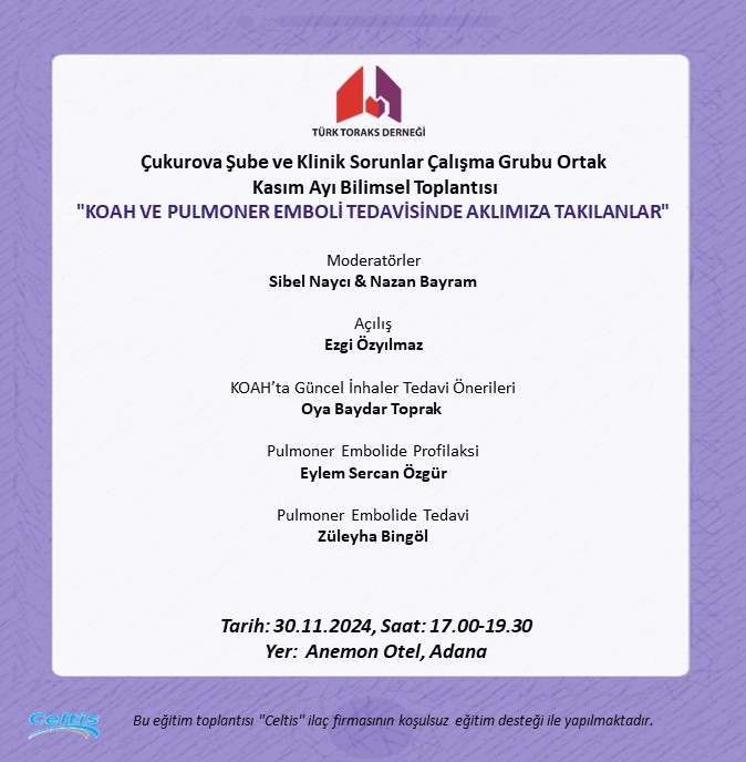 Türk Toraks Derneği Çukurova Şubesi ve Klinik Sorunlar Çalışma Grubu Ortak Kasım Ayı Bilimsel Toplantı Duyurumuz: "KOAH ve Pulmoner Emboli Tedavisinde Aklımıza Takılanlar"