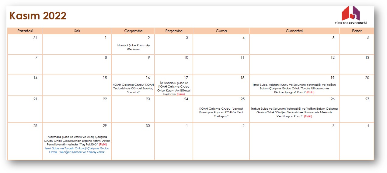 Türk Toraks Derneği Kasım 2022 Etkinlik Takvimi